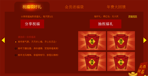 3. 使用紅包兌獎,每種獎品每人限兌1次,獎品數量有限,先到先得;使用紅包抽獎,每次花費1個紅包,由先到后依次按“幸福、團圓、平安、健康、發財”順序消耗紅包;