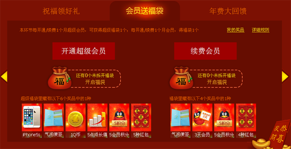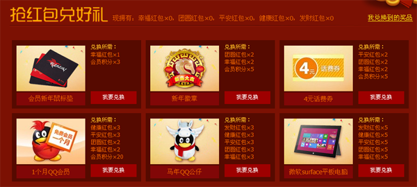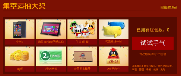 慶祝2014新年,QQ會員推出了“祈福迎新春,紅包大派送”活動,收集紅包不僅可以兌換,也可以參與抽獎,獎品包括小米3、微軟surface平板電腦、Q幣等,趕緊來參加吧。