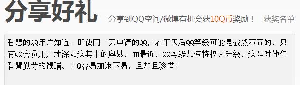 3、分享到QQ空間或者騰訊微博,我們會從中抽取200名幸運用戶贈送10Q幣,活動截止后7天內公布獲獎名單并自動贈送至您的Q幣賬戶。