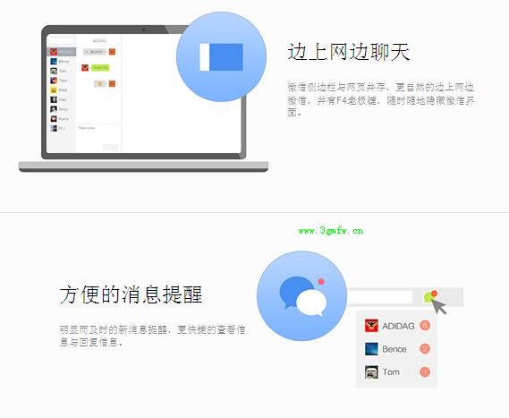 微信側(cè)邊欄與網(wǎng)頁并存,更自然的邊上網(wǎng)邊微信,并有F4老板鍵,隨時隨地隱藏微信界面。