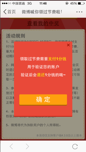 3、參加活動時請確保支付寶能夠正常收款,如果發放過節費時由于支付寶狀態異常(如未實名認證等)以及解除支付寶與微博賬號的綁定等原因,導致不能正常收款,將無法得到現金獎勵;