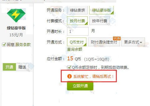 新出來的玩意當然要嘗鮮下,何況還得跟小伙伴們分享圖標呢,所以小編想用Q幣先開一個月試試。結果不同的時間測試超過10次都一樣的提示“系統繁忙,請稍后再試”!尼瑪,馬總要是看到這個,會不會把綠鉆的部門經理給撤銷了?如下圖: