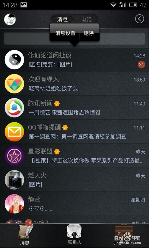 進入消息界面后我們只需要長按那些想要接收群消息但不提醒的群,這時就會出現消息管理和刪除的選項,如圖所示。