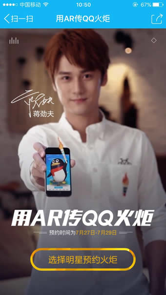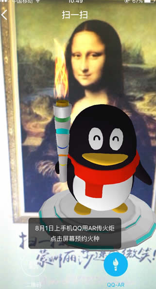 用戶可打開最新版手機qq點擊“掃一掃-QQ-AR”掃描“蒙娜麗莎”,會出現一只滑翔傘AR企鵝,提示用戶趕緊參與火炬傳遞。
