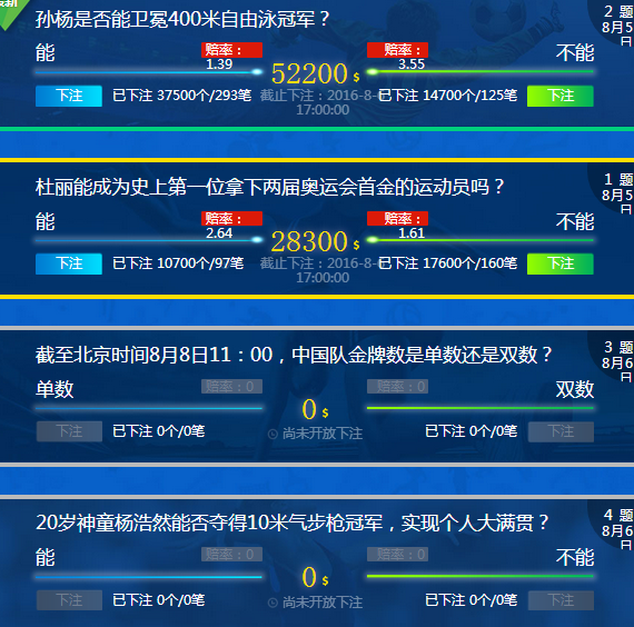 6、活動期間競猜題目更新時間/投注截至時間/發獎時間都統一為每天17:00。(舉例說明:競猜題目8月7日9點孫楊400米自由泳是否能衛冕冠軍?題目上線時間:8月5日17:00;投注截至時間:8月6日17:00;奧運幣發獎時間:8月7日17:00)