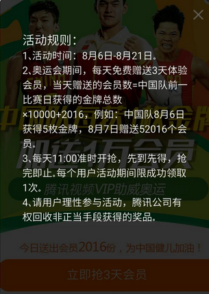 參與方式:打開手機qq或微信掃碼,進入活動入口;為奧運助威,中國隊每獲1枚金牌,加送1萬會員。只要掃碼進入活動頁面,點擊中間立即搶3天VIP就有機會領到3天VIP。活動規則:每天11點開始搶,每個人限搶到一次。