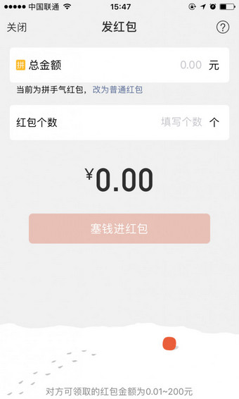 3.點開后,其實怎么發紅包跟之前的還是一樣。但紅包金額數顯示為0.01~200元。