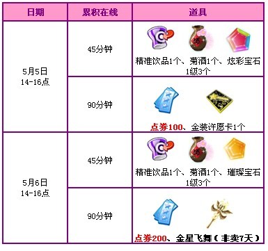 5月6日指定時間累積在線90分鐘即可獲得200點券+非賣金星飛舞7天。