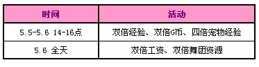 5.5-5.6每天14至16點雙倍經驗+雙倍G幣+四倍寵物經驗。