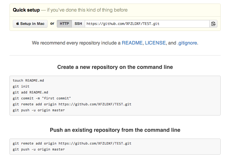 然后GitHub自動(dòng)給你生成關(guān)于托管你本工程的簡單命令行,HTTP 、SSH后面的連接為你創(chuàng)建的遠(yuǎn)程倉庫地址