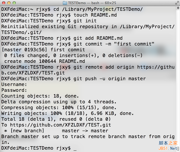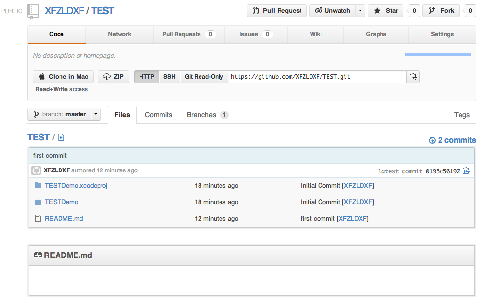 3.打開xcode創(chuàng)建一個(gè)工程,比如我創(chuàng)建的工程名TESTDemo,然后打開終端,進(jìn)入TESTDemo文件夾,輸入Creat a new repository on the command line提示的命令