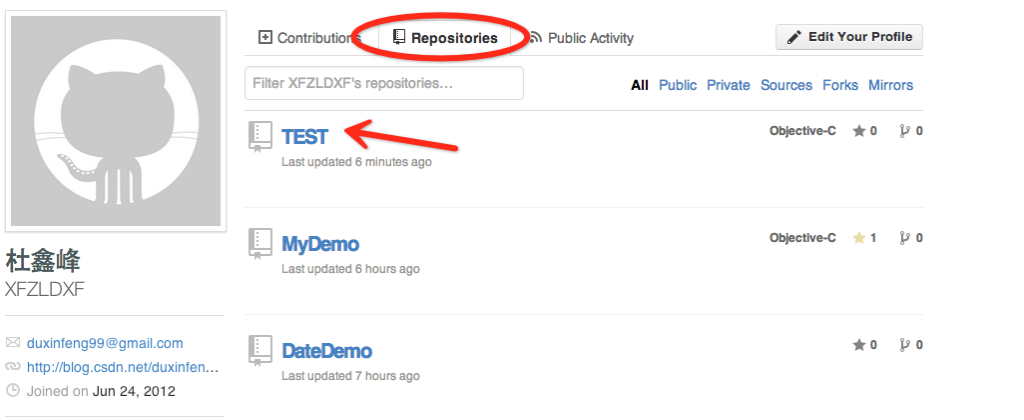 4.然后在就可以在你的GitHub賬號(hào)的Repositories中找到你剛剛在終端上替交的TESTDemo代碼工程:如圖
