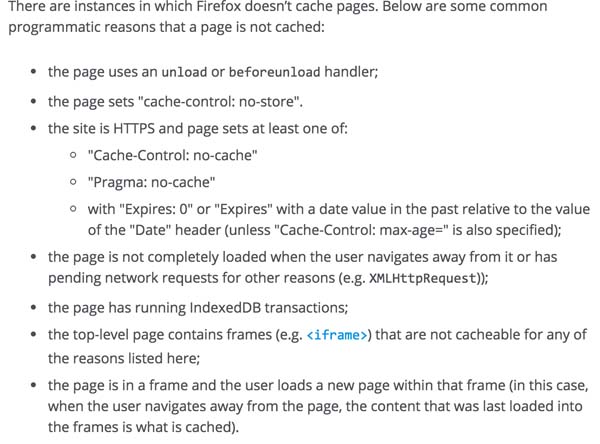 這個緩存中不僅保存著頁面數據,還保存了DOM和JavaScript的狀態;實際上是將整個頁面都保存在了內存里。也就是說“后退”不光意味著html/js/css/接口等動靜態資源不會重新請求,連JS也不會重新執行。