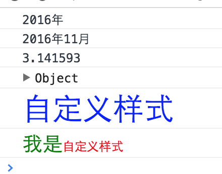 console.log("%s年",2016);//%s表示字符串console.log("%d年%d月",2016,11);//%d表示整數(shù)console.log("%f",3.1415926);//%f小數(shù)console.log("%o",console);//%o表示對象console.log("%c自定義樣式","font-size:30px;color:#00f");console.log("%c我是%c自定義樣式","font-size:20px;color:green","font-size:10px;color:red");