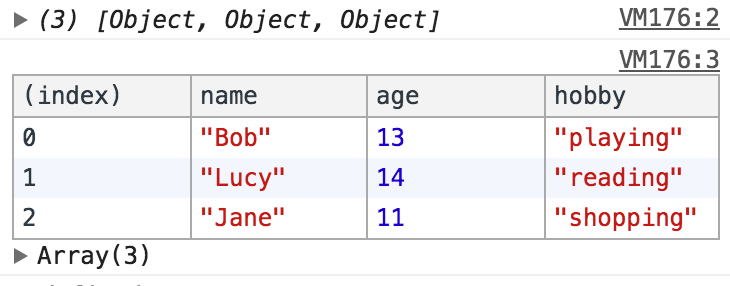 var stu = [{name:"Bob",age:13,hobby:"playing"},{name:"Lucy",age:14,hobby:"reading"},{name:"Jane",age:11,hobby:"shopping"}];console.log(stu);console.table(stu);