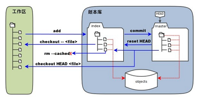 圖中左側為工作區,右側為版本庫。在版本庫中標記為 “index” 的區域是暫存區(stage, index),標記為 “master” 的是 master 分支所代表的目錄樹。