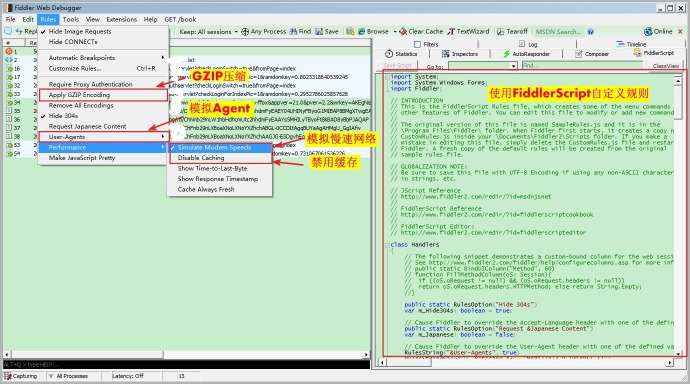 低網(wǎng)速模擬有時(shí)出于兼容性考慮或者對(duì)某處進(jìn)行性能優(yōu)化,在低網(wǎng)速下往往能較快發(fā)現(xiàn)問(wèn)題所在也容易發(fā)現(xiàn)性能瓶頸,可惜其他調(diào)試工具沒(méi)能提供低網(wǎng)速環(huán)境,而強(qiáng)大的Fiddler考慮到了這一點(diǎn),能夠進(jìn)行低網(wǎng)速模擬設(shè)置Rules > Performance > Stimulate Modem Speeds。