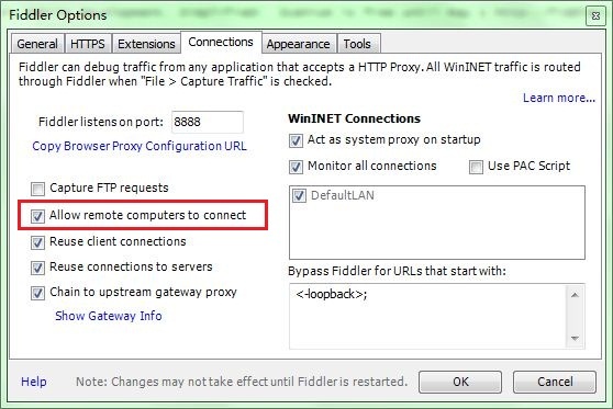 選中"Allow remote computers to connect". 是允許別的機(jī)器把HTTP/HTTPS請(qǐng)求發(fā)送到Fiddler上來(lái)