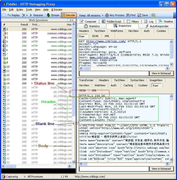 Fiddler的主界面分為 工具面板、會(huì)話面板、監(jiān)控面板、狀態(tài)面板