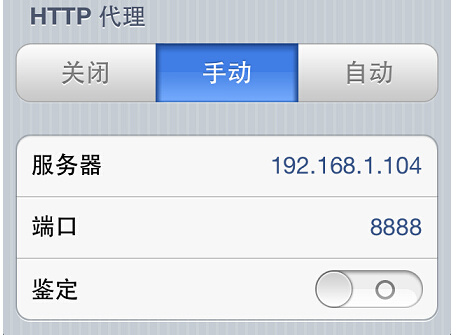 打開(kāi)IPhone, 找到你的網(wǎng)絡(luò)連接, 打開(kāi)HTTP代理, 輸入Fiddler所在機(jī)器的IP地址(比如:192.168.1.104) 以及Fiddler的端口號(hào)8888