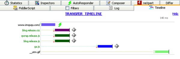 把多個(gè)請(qǐng)求以時(shí)間作為 X 軸,用圖表的形式展現(xiàn)出來(lái),就形成了瀑布圖。在Fiddler中,只要在左側(cè)選中一些請(qǐng)求,右側(cè)選擇Timeline標(biāo)簽,就可以看到這些請(qǐng)求的瀑布圖