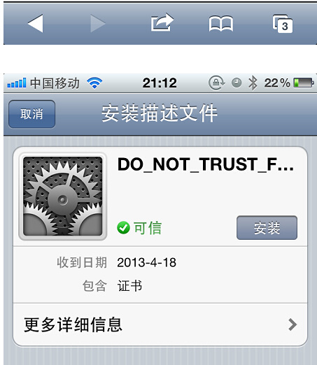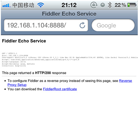 首先要知道Fiddler所在的機(jī)器的IP地址: 假如我安裝了Fiddler的機(jī)器的IP地址是:192.168.1.104打開(kāi)IPhone 的Safari, 訪問(wèn) http://192.168.1.104:8888, 點(diǎn)"FiddlerRoot certificate" 然后安裝證書(shū)
