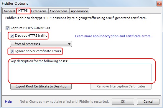 Fiddler不僅能監(jiān)聽(tīng)HTTP請(qǐng)求而且默認(rèn)情況下也能捕獲到HTTPS請(qǐng)求,Tool -> Fiddler Option -> HTTPS下面進(jìn)行設(shè)置,勾選上“Decrypt HTTPS traffic”,如果不必監(jiān)聽(tīng)服務(wù)器端得證書(shū)錯(cuò)誤可以勾上“Ignore server certification errors”,也可以跳過(guò)幾個(gè)指定的HOST來(lái)縮小或者擴(kuò)大監(jiān)聽(tīng)范圍。
