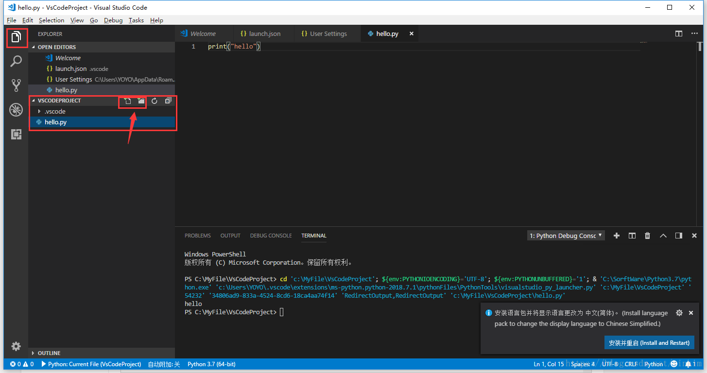 如下圖,點(diǎn)擊左邊文件的圖標(biāo),鼠標(biāo)移到工程的目錄名,我的是VSCODEPROJECT,會出來一個(gè)有個(gè)+號的文件,點(diǎn)擊,然后輸入hello.py就會會生成.py文件,如何print("hello"),點(diǎn)擊F5,在下面的調(diào)試窗口會出來一個(gè)hello,沒有報(bào)錯(cuò)就說明已經(jīng)配置成功了,接下來就可以進(jìn)行Python的開發(fā)了。