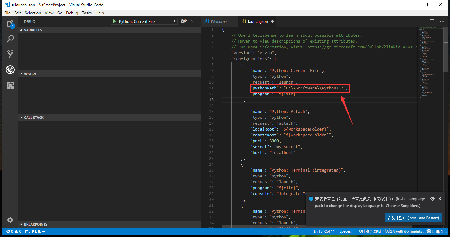 選擇Python后會生成Python的配置文件launch.json,加入Python的安裝目錄:<"pythonPath": "C://SorftWare//Python3.7",>,記得是雙斜桿,否則會報(bào)錯(cuò)。