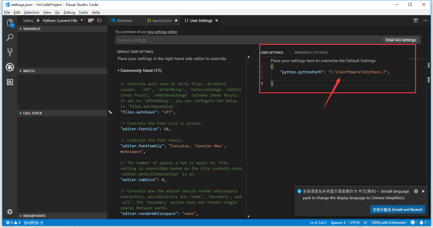 點(diǎn)擊File->Prefrences->Settings,生成一個(gè)“User Settings”文件,填入Python安裝目錄:<"python.pythonPath": "C://SorftWare//Python3.7",>,如下圖所示