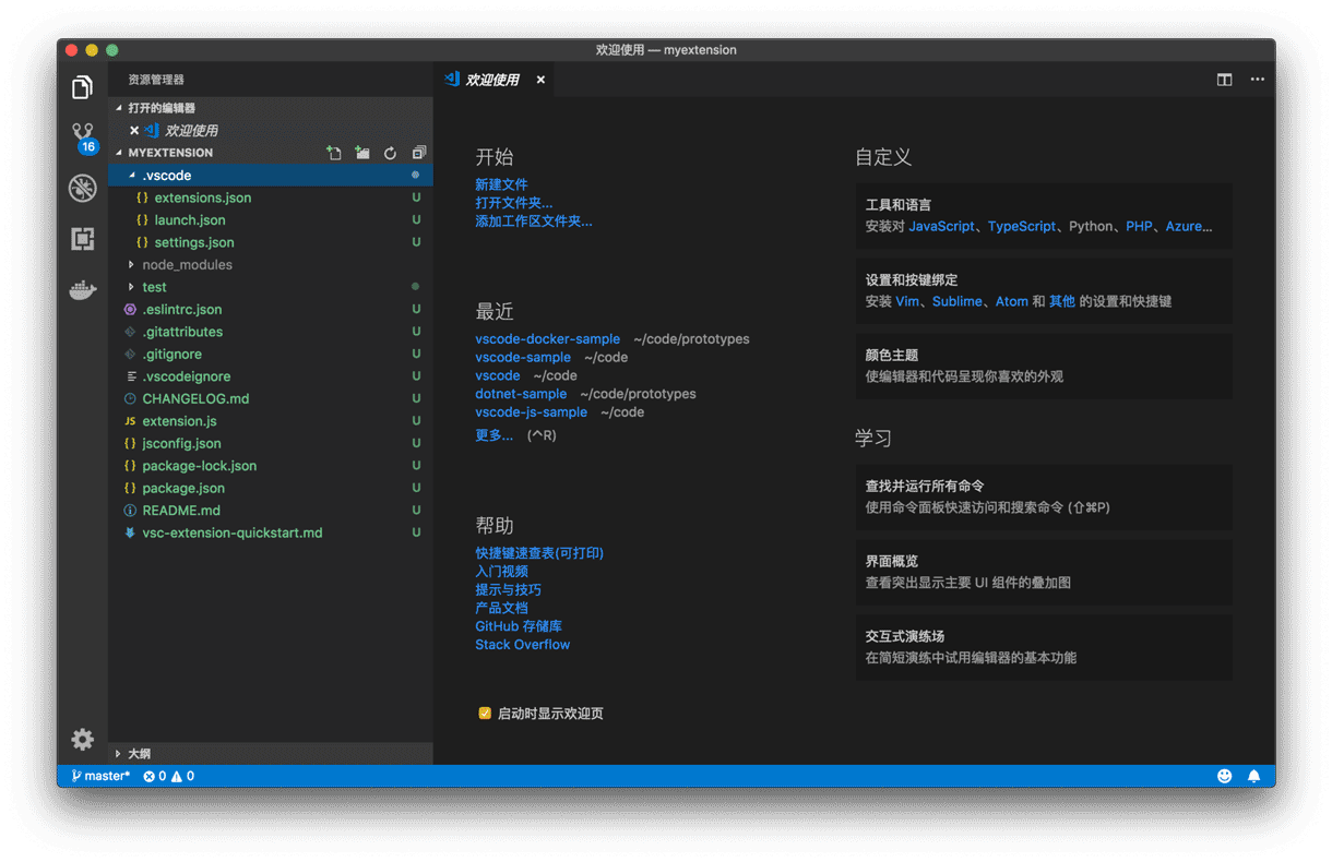 好了,下面我們來看看 extension.js 和 package.json。看完它們,你就對 VS Code 插件是如何運行的有很好的理解的。