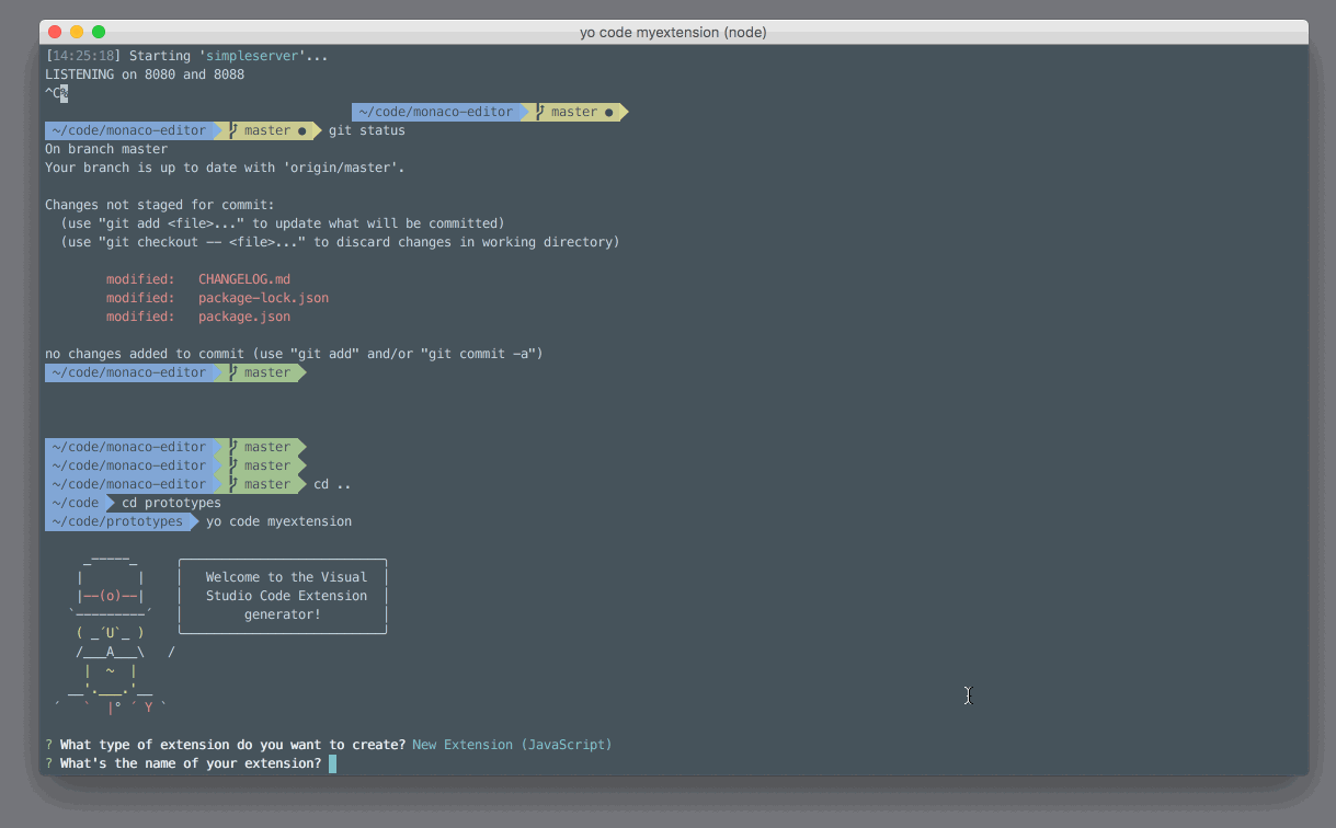 有了腳手架,你就可以創建一個 VS Code 的插件模板了。接下來運行: