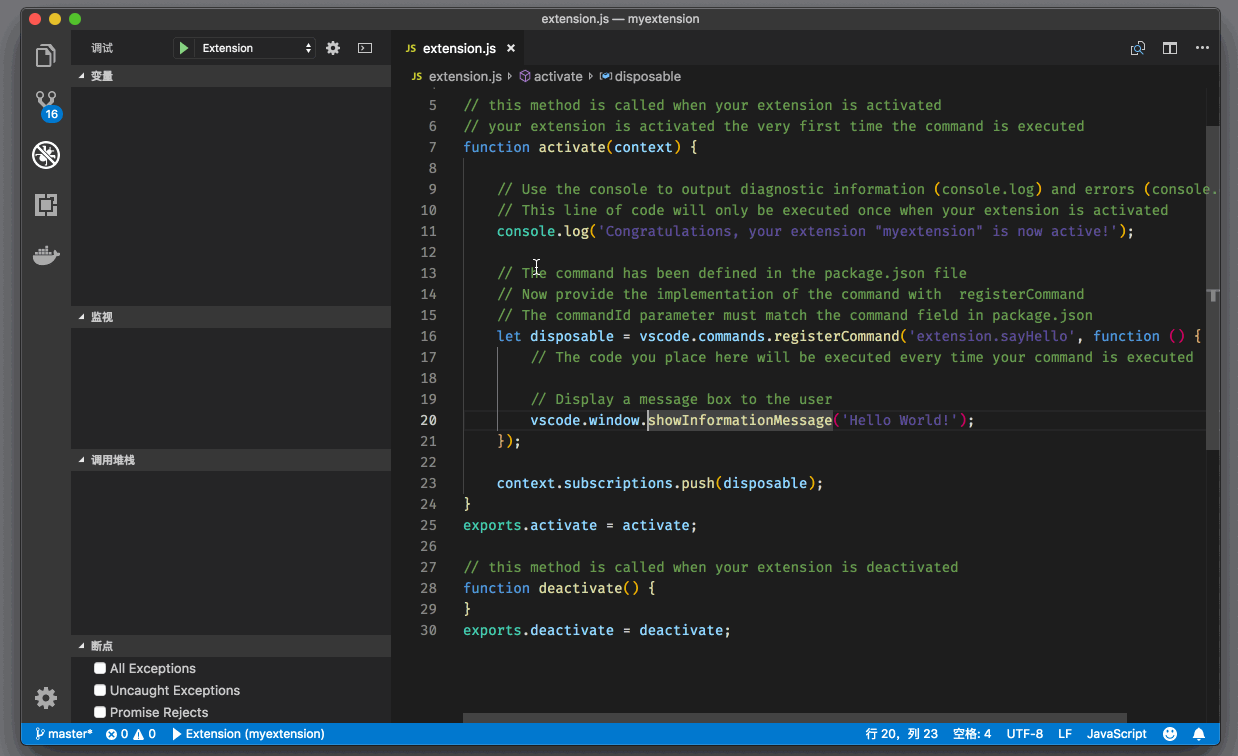 上面我提到了,這個插件只有在 “Hello World” 命令被執行時才會被激活。那下面我們不妨把這個調試窗口關掉,然后再 activate 函數中加上斷點,重新試一次。