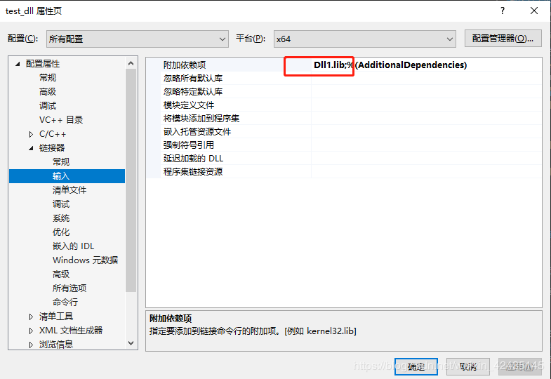 3.容易漏掉的一步,記住千萬要把你的添加的lib文件名加入到附加依賴項中,否則會報錯。
