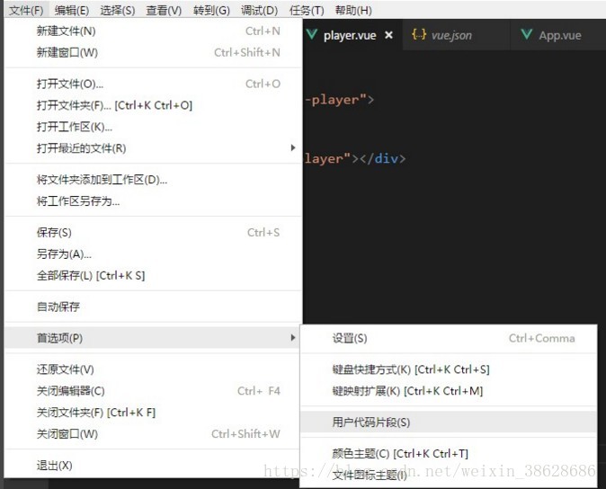 1.選擇菜單里的 文件 > 首選項(xiàng) > 用戶代碼片段