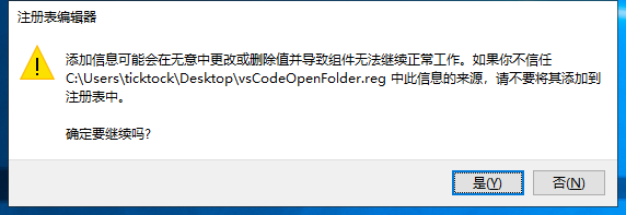 Windows Registry Editor Version 5.00[HKEY_CLASSES_ROOT/*/shell/VSCode]@="Open with Code""Icon"="C://Users//ticktock//AppData//Local//Programs//Microsoft VS Code//Code.exe"[HKEY_CLASSES_ROOT/*/shell/VSCode/command]@="/"C://Users//ticktock//AppData//Local//Programs//Microsoft VS Code//Code.exe/" /"%1/"" Windows Registry Editor Version 5.00[HKEY_CLASSES_ROOT/Directory/shell/VSCode]@="Open with Code""Icon"="C://Users//ticktock//AppData//Local//Programs//Microsoft VS Code//Code.exe"[HKEY_CLASSES_ROOT/Directory/shell/VSCode/command]@="/"C://Users//ticktock//AppData//Local//Programs//Microsoft VS Code//Code.exe/" /"%V/""Windows Registry Editor Version 5.00[HKEY_CLASSES_ROOT/Directory/Background/shell/VSCode]@="Open with Code""Icon"="C://Users//ticktock//AppData//Local//Programs//Microsoft VS Code//Code.exe"[HKEY_CLASSES_ROOT/Directory/Background/shell/VSCode/command]@="/"C://Users//ticktock//AppData//Local//Programs//Microsoft VS Code//Code.exe/" /"%V/""