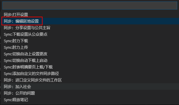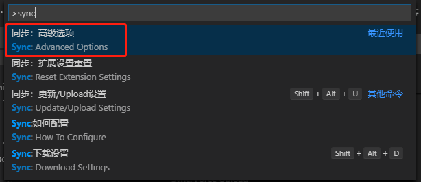 回到VSCode編輯器中 使用快捷鍵Ctrl+P 輸入命令 >sync 點(diǎn)擊 同步:高級(jí)選項(xiàng)