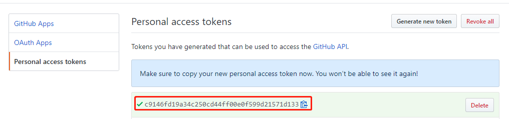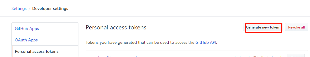 在Settings頁面點(diǎn)擊進(jìn)入 Developer settings (開發(fā)者設(shè)置)再點(diǎn)擊進(jìn)入Personal access tokens (個(gè)人授權(quán)令牌)頁面生成一個(gè)令牌 點(diǎn)擊 Generate new token