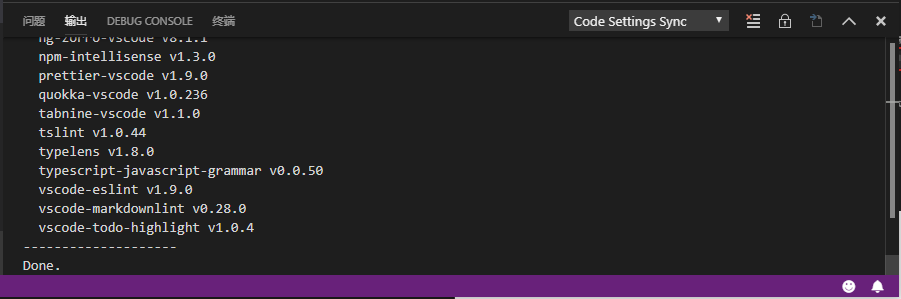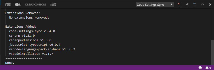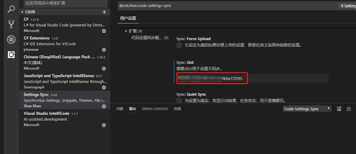 Settings Sync擴(kuò)展 會(huì)在輸出區(qū)域提示 這里提示沒有擴(kuò)展別移除(因?yàn)榈谝淮瓮? 然后6個(gè)擴(kuò)展被同步。