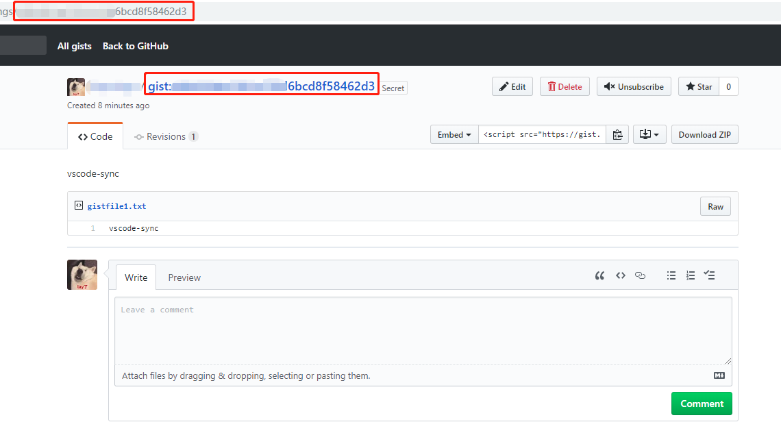 手動(dòng)復(fù)制剛才創(chuàng)建的Gist倉庫的ID:它顯示在瀏覽器url最后一串字符串或者截圖中第二個(gè)框gist冒號(hào)后面的字符串(如下圖)把它保存在你的記事本中
