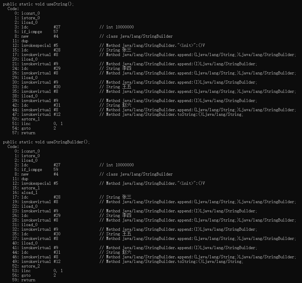 使用 javap -c StringTest.class 反編譯查看兩個方法編譯后的文件: