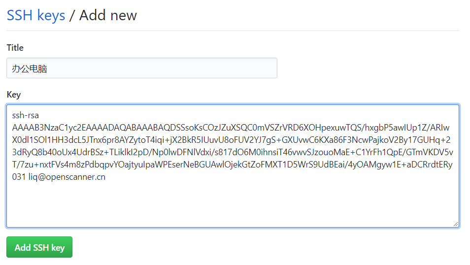 然后用文本工具打開之前生成的id_rsa.pub文件,把內容拷貝到key下面的輸入框,并為這個key定義一個名稱(通常用來區分不同主機),然后保存: