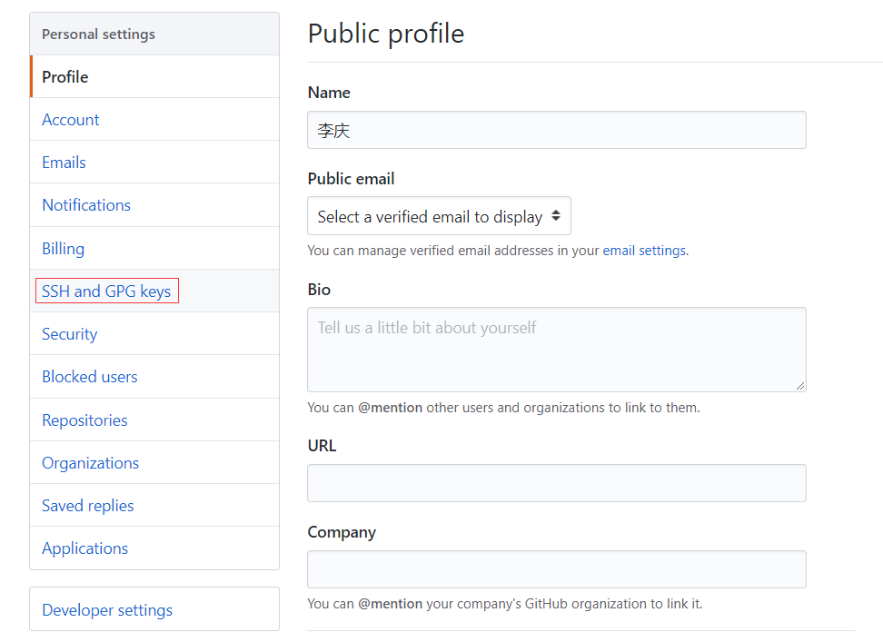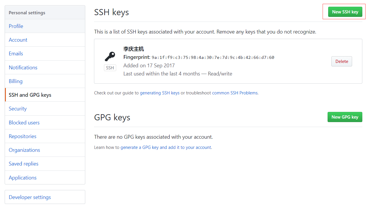 之前生成的是ssh秘鑰,所以下面選擇New SSH key(筆者這里已經配置了一個key,如果是未配置秘鑰的用戶,這里應該是空的):