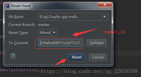 也可以直接使用IDEA的Reset Head 功能,先通過git log 得到要回退的commit_id,再進行下面截圖的操作。可以先validate一下哦,看通過commit_id能不能找到這一次提交。