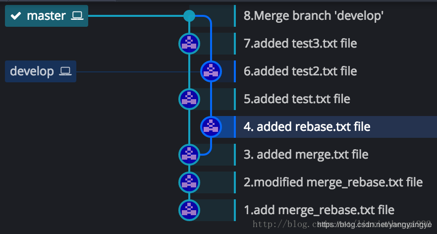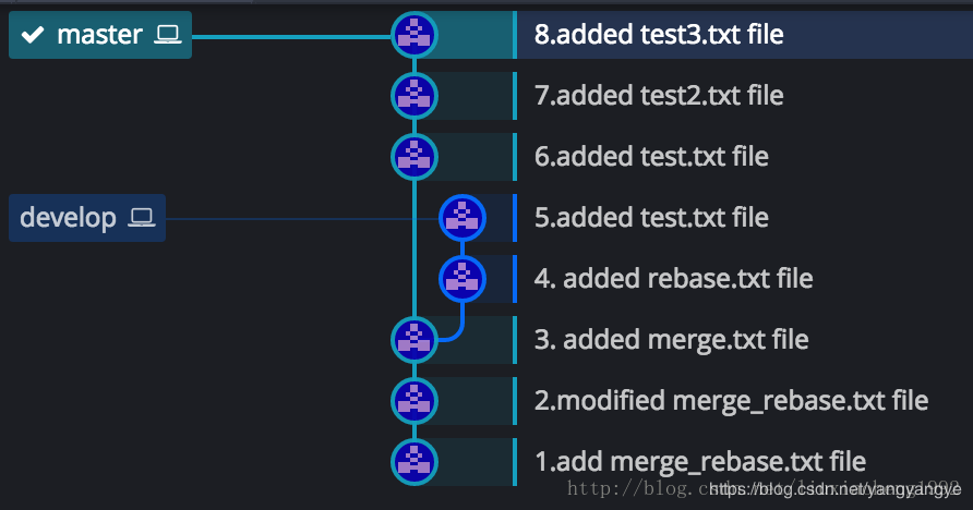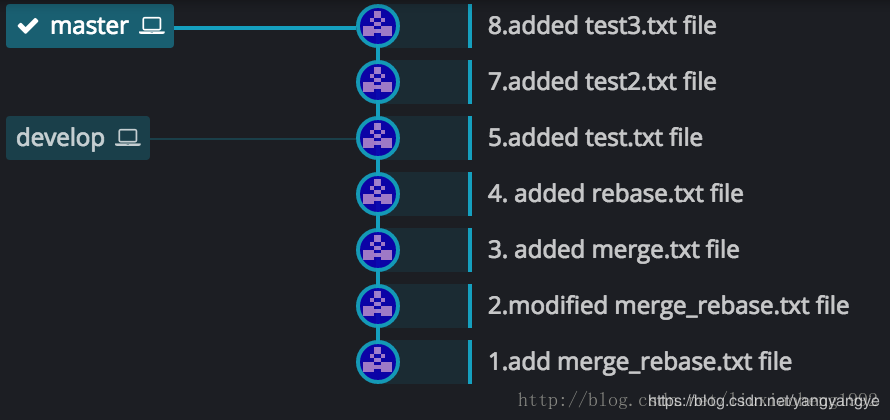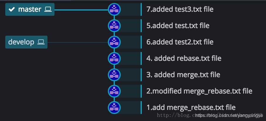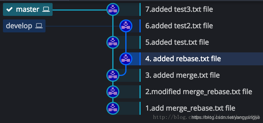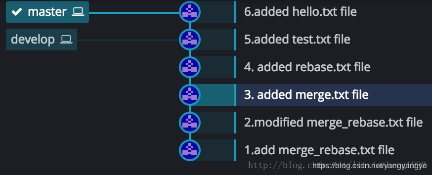 和之前一樣的是,develop分支也是在 (3.added merge.txt file)處從master分支拉取develop分支。不一樣的是兩個分支各個commit的時間不同,之前develop分支的4和5commit在master分支3之后6之前,現在是develop分支的4提交早于master分支的5提交,develop分支的6提交晚于master的5提交早于master的7提交。