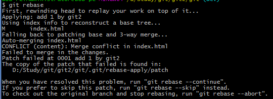 (2)若本地對文件修改,沒有add,rebase時,會提示“Cannot rebase: You have unstaged changes.Please commit or stash them.”,add后沒有commit,會提示“Cannot rebase: Your index contains uncommitted changes.Please commit or stash them.”。commit后,如果沒有修改同一文件,rebase不會沖突。