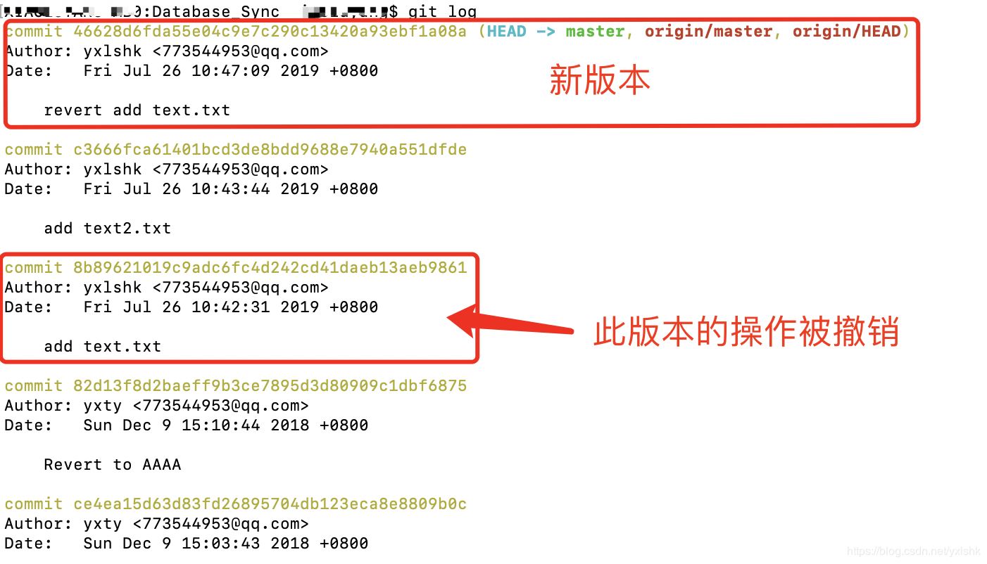 此時可以用“git log”查看本地的版本信息,可見多生成了一個新的版本,該版本反做了“add text.txt”版本,但是保留了“add text2.txt”版本: