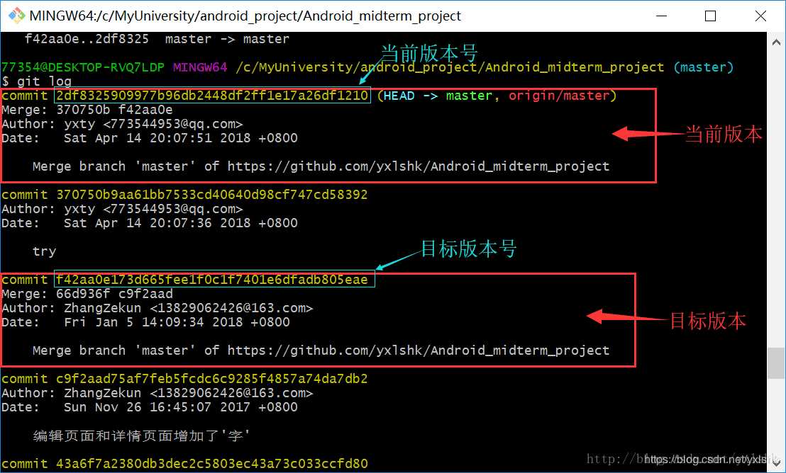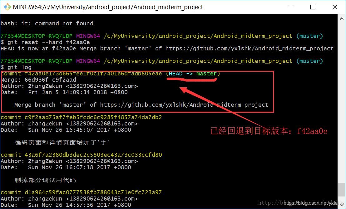 再用“git log”查看版本信息,此時本地的HEAD已經指向之前的版本:
