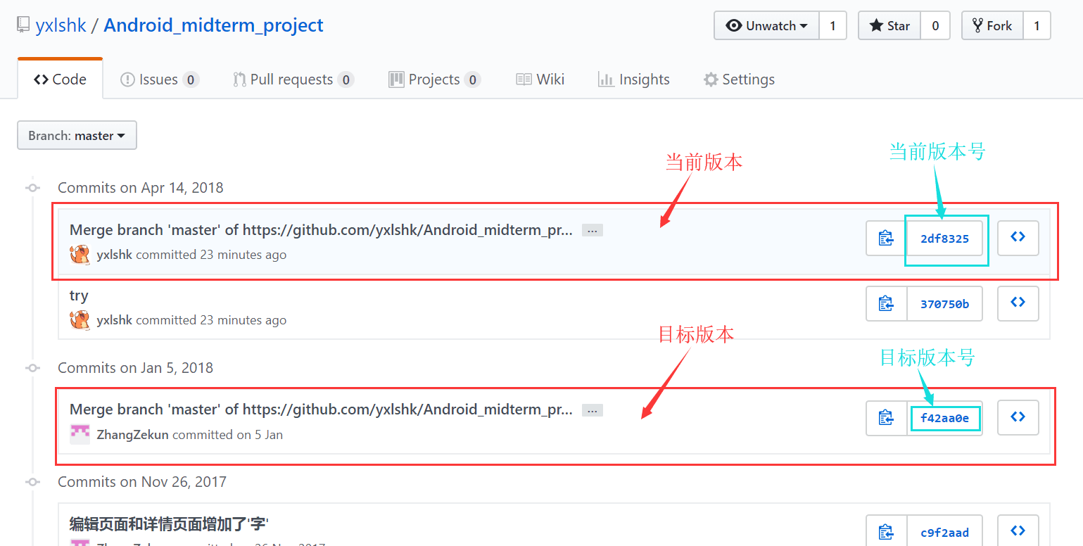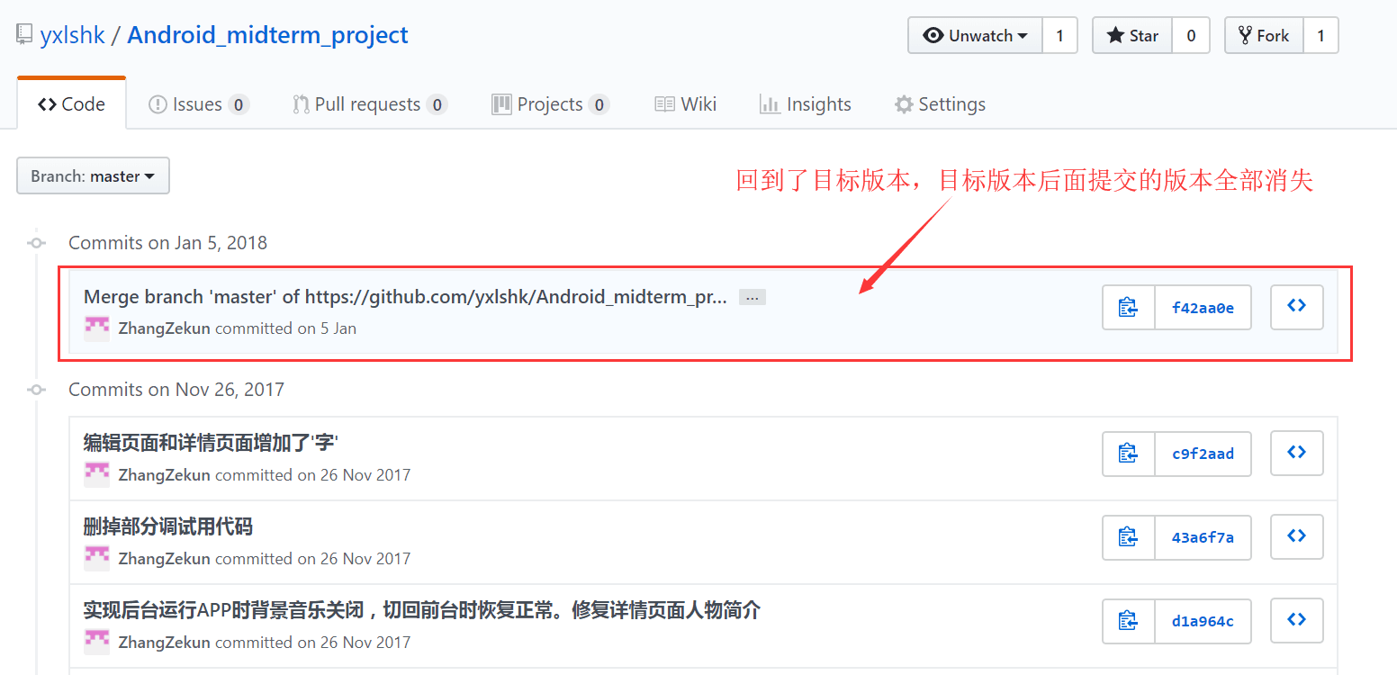 在github圖形化界面上看,遠程庫的HEAD也已經指向目標版本: