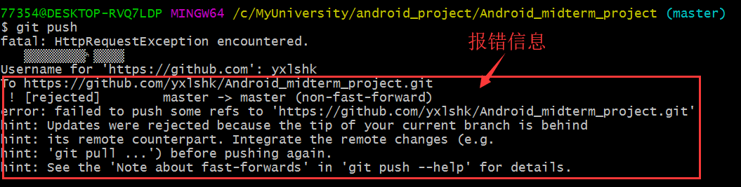 此時如果用“git push”會報錯,因為我們本地庫HEAD指向的版本比遠程庫的要舊: